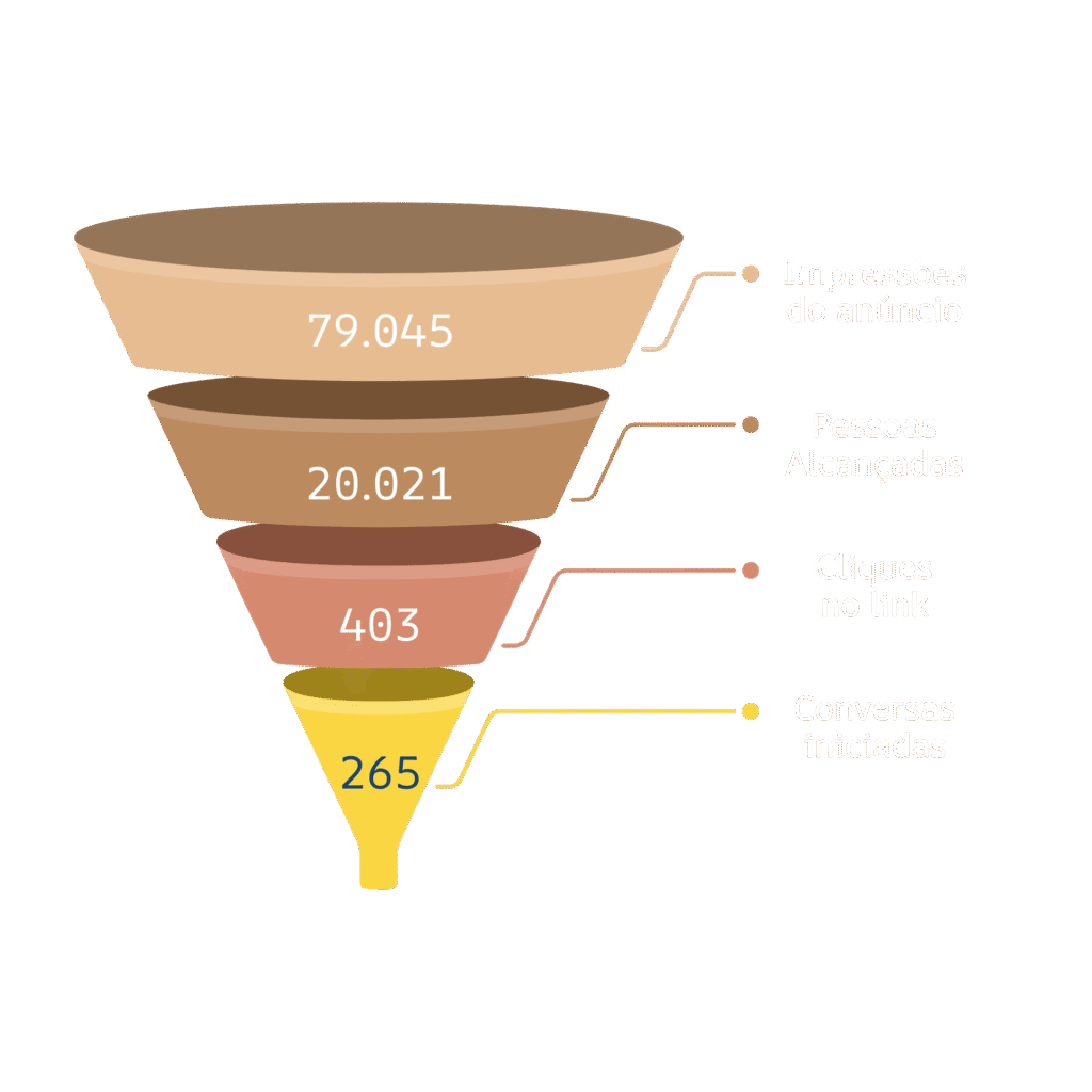 Acompanhamos os resultados e mostramos tudo de forma clara: quantas pessoas alcançamos, quantas interagiram, quantas mensagens chegaram e quanto custou cada resultado.